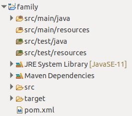 By clicking Finish in the Eclipse’s Maven wizard, you should see a new Maven project in the Eclipse’s explorer. Currently, Eclipse creates a default pom.xml file that uses Java 5 and has no dependencies. Replace hence the content of the pom.xml file that has been created in the io-hotmoka-tutorial-examples-family project with the following code: