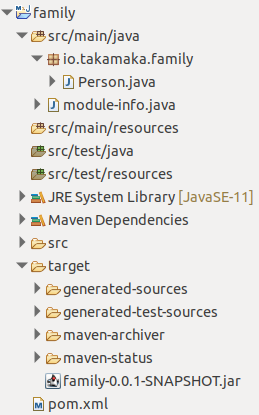 Package the project into a jar and install it in the local Maven repository, by running the Maven command mvn install inside the directory of the project (that is, inside the subdirectory hotmoka_tutorial/io-hotmoka-tutorial-examples-family). This should generate a file named io-hotmoka-tutorial-examples-family-1.11.5.jar, inside the target directory. Only the compiled class files will be relevant: Hotmoka nodes will ignore source files, manifest and any resources in the jar; the same compiled module-info.class is irrelevant for Hotmoka. All such files can be removed from the jar, to reduce the gas cost of their installation in the store of a node, but we do not care about this optimization here. The result should look as in Fig. 3.2.