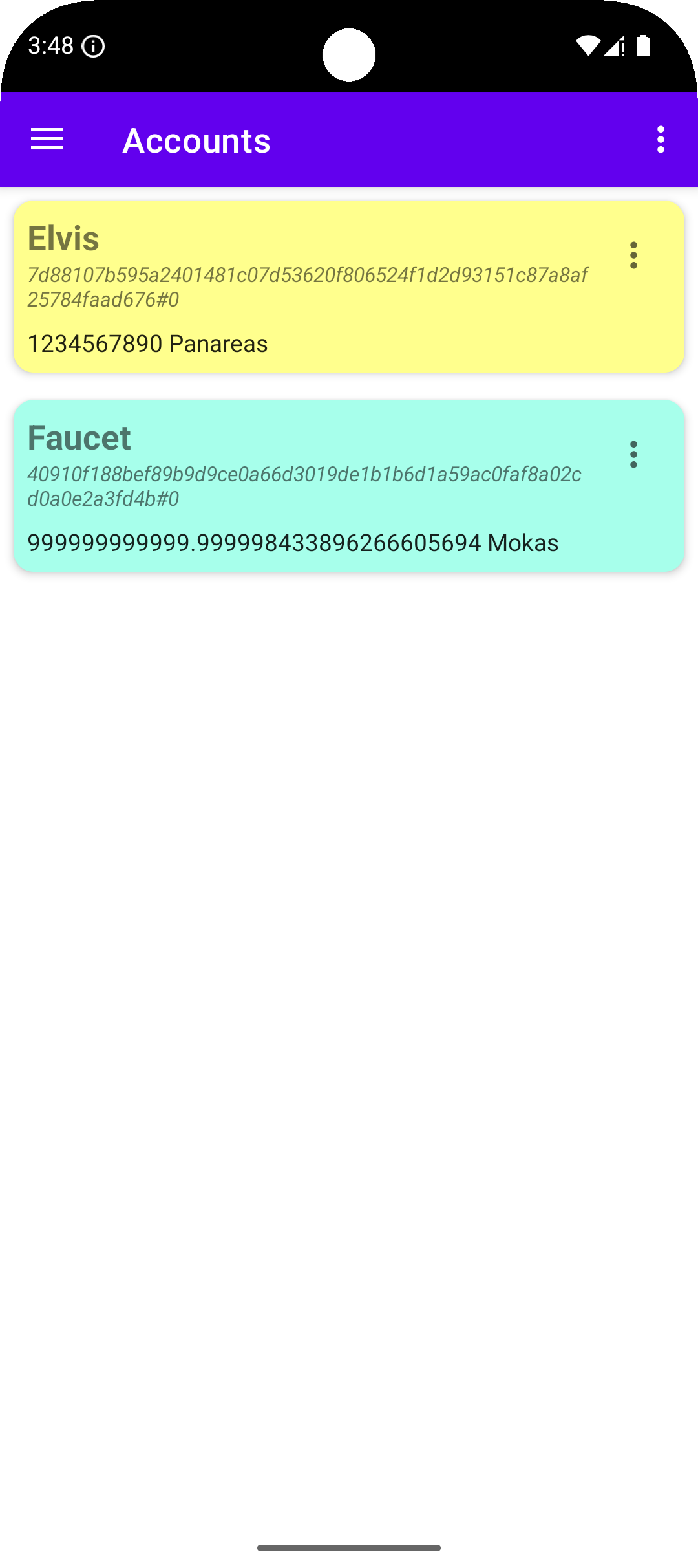 The creation of a new account from the faucet is possible from the Mokito app as well. Namely, use the menu of the app to tap on the Accounts item to see the list of available accounts (Fig. 2.2). From there, tap on the menu icon on the right of the Faucet account and select Create a new account (see Fig. 2.6a).