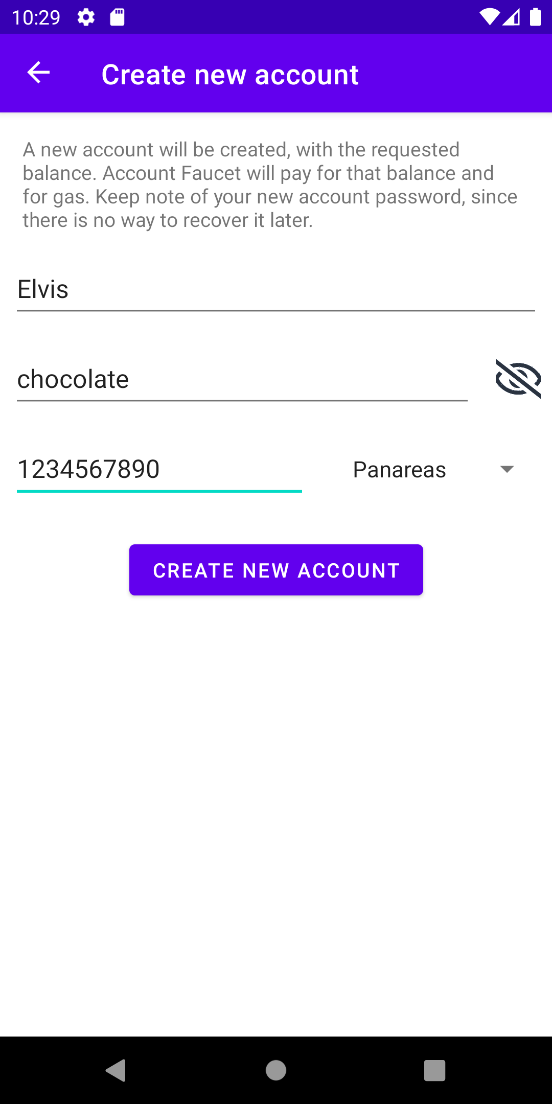 A form will appear, where you can specify the name for the account, its password and the initial balance (that will be paid by the faucet). For instance, you can fill it as in Fig. 2.6b.