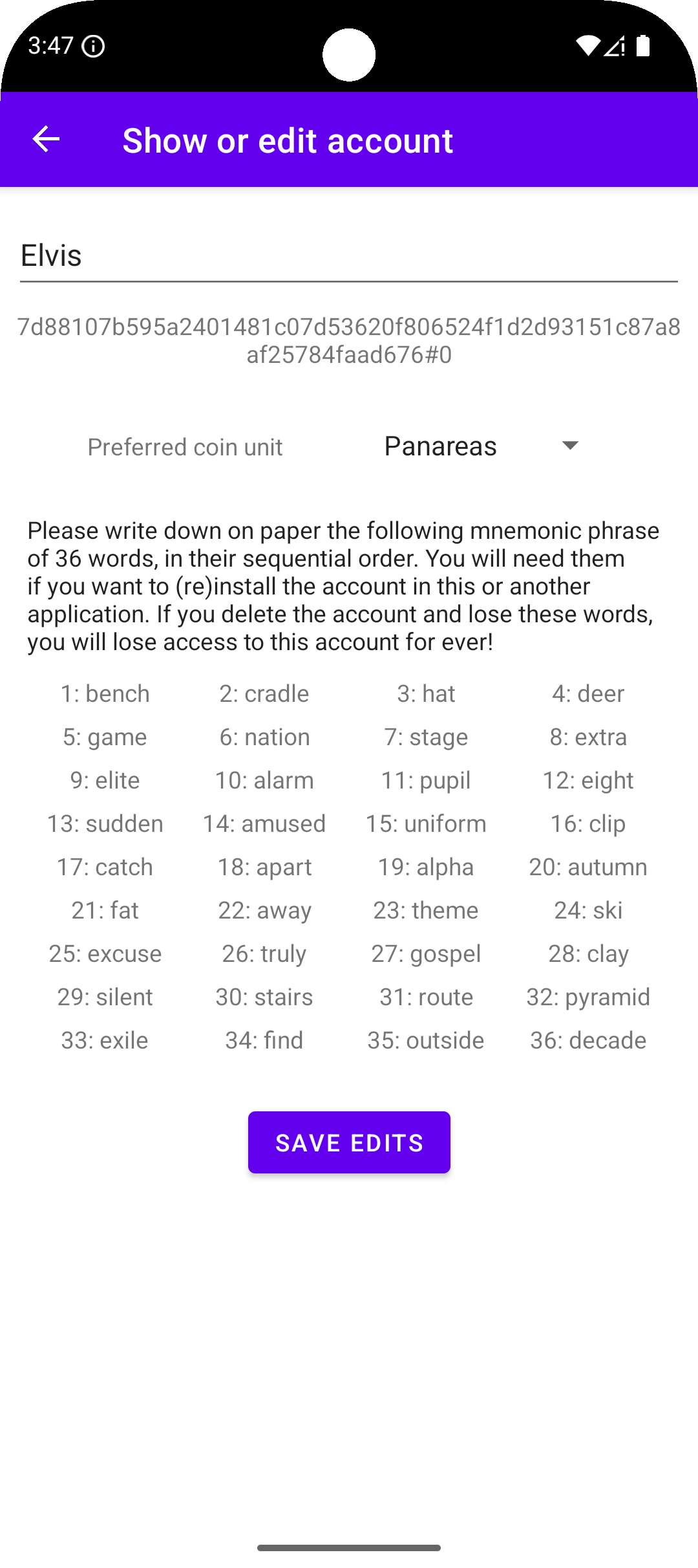 After tapping on the Create new account button, the new account will be created and its information will be shown, as in Fig. 2.7a. Note, in this screen, the storage reference of the new account and the presence of a 36 words passphrase.