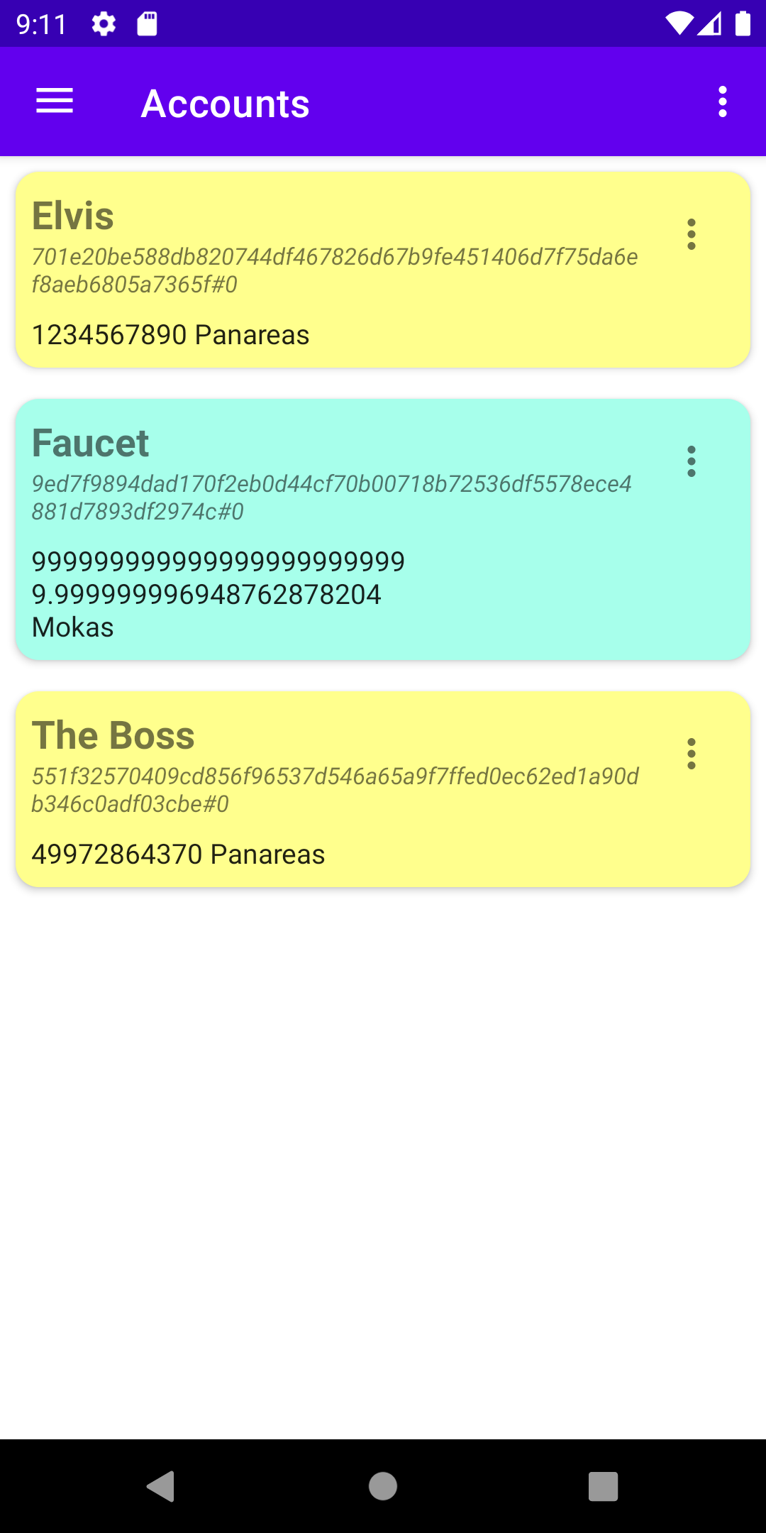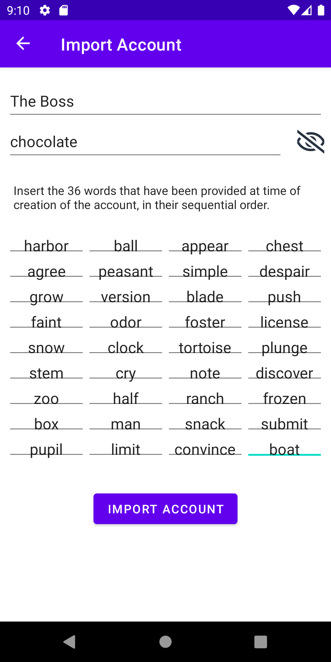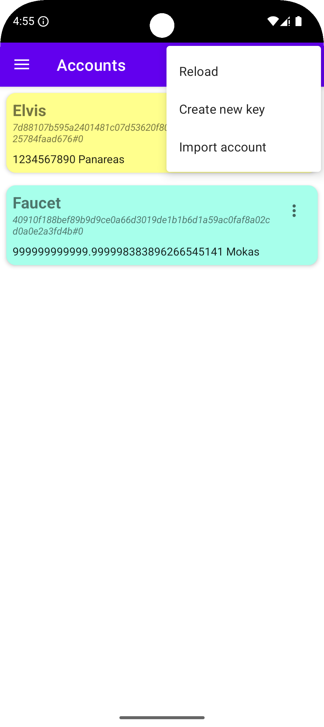 Then go to the accounts page of Mokito and show the top-right menu of the accounts page; select Import account (see Fig. 2.8a). In the screen that will appear, insert the name that you want to give to the account, its password and its 36 words passphrase (Fig. 2.8b). Tap on the Import Account button. The new account will show in the list of available accounts (Fig. 2.9). From this moment, it will be possible to control the account from Mokito.